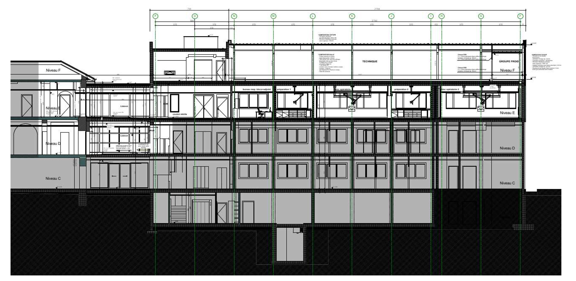 - Transformation intérieure du bâtiment 2 – 1916 Les travaux ne modifient pas la structure intérieure du bâtiment historique recensé en Valeur C. Une nouvelle répartition des locaux est faite pour optimiser le fonctionnement du service.